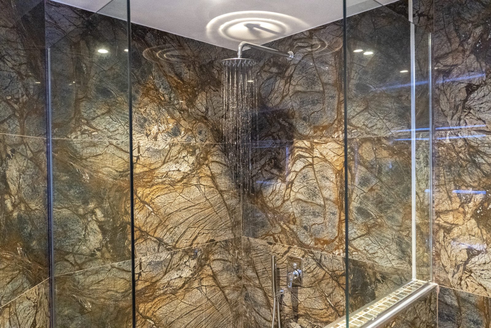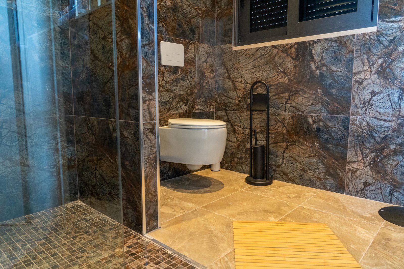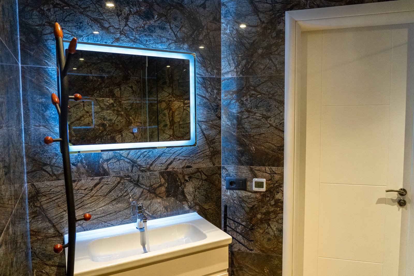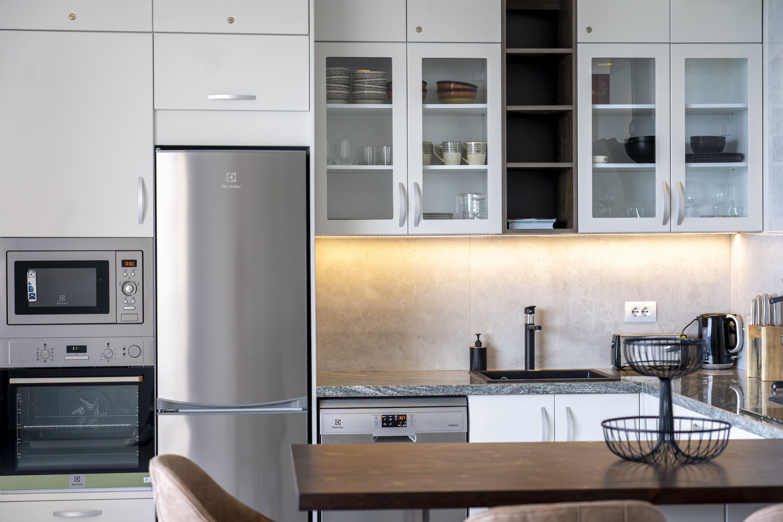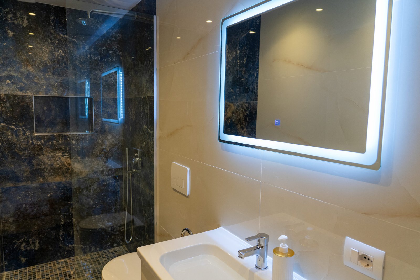 Inside, Aura features a comfortable and practical layout with two bedrooms and two modern bathrooms finished in elegant marble style surfaces. The kitchen is contemporary and fully equipped with quality appliances, seamlessly connected to the living and dining area. Every detail, from the ceiling lighting to the cabinetry and glass finishes, reflects thoughtful investment and attention to quality.